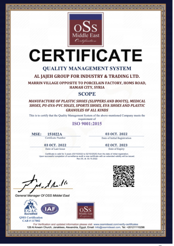 ﺗﻌﺘﺒﺮ ﻣﺠﻤﻮﻋﺔ ﺷﺮﻛﺎت اﻟﺠﺎﺟﺔ ﻟﻠﺼﻨﺎﻋﺔ واﻟﺘﺠﺎرة ﻣﻦ اﻟﺸﺮﻛﺎت اﻟﺮاﺋﺪة ﻓﻲ ﺗﺠﺎرة وﺻﻨﺎﻋﺔ اﻷﺣﺬﻳﺔﺑﻜﺎﻓﺔ ﻓﺮوﻋﻬﺎ ، ﻓﻘﺪ ﺗﺄﺳﺴﺖ اﻟﺸﺮﻛﺔ ﻓﻲ ﻋﺎم 1987 و ﻛﺎﻧﺖ اﻹﻧﻄﻼﻗﺔ اﻷوﻟﻰ ﻓﻲ ﻋﺎﻟﻢ اﻟﺘﻜﻨﻮﻟﻮﺟﻴﺎﺗﻠﺒﻴﺔ ﻟﺮﻏﺒﺔ اﻷﺳﻮاق ﺣﻴﺚ إﻧﻄﻠﻘﻨﺎ ﻣﻦ ﻣﻬﻨﺔ اﻷﺑﺎء إﻟﻰ ﻓﻦ اﻷﺑﻨﺎء ﺑﺈﺳﺘﺨﺪام اﻟﺘﻜﻨﻮﻟﻮﺟﻴﺎ اﻟﺤﺪﻳﺜﺔ ،وﺗﻢ ﺗﺴﺠﻴﻞ ﻣﺠﻤﻮﻋﺔ اﻟﺠﺎﺟﺔ ﻟﻠﺼﻨﺎﻋﺔ واﻟﺘﺠﺎرة ﺑﺘﺎرﻳﺦ 1987 ﻓﻲ اﻟﺠﻤﻬﻮرﻳﺔ اﻟﻌﺮﺑﻴﺔ اﻟﺴﻮرﻳﺔﻹﻧﺘﺎج ﻧﻌﺎل اﻟﺒﻮرﻳﺘﺎن واﻷﺣﺬﻳﺔ اﻟﺒﻼﺳﺘﻴﻜﻴﺔ واﻟﺮﻳﺎﺿﻴﺔ واﻹﻳﻔﺎ وإﻧﺘﺎج اﻟﺤﺒﻴﺒﺎت